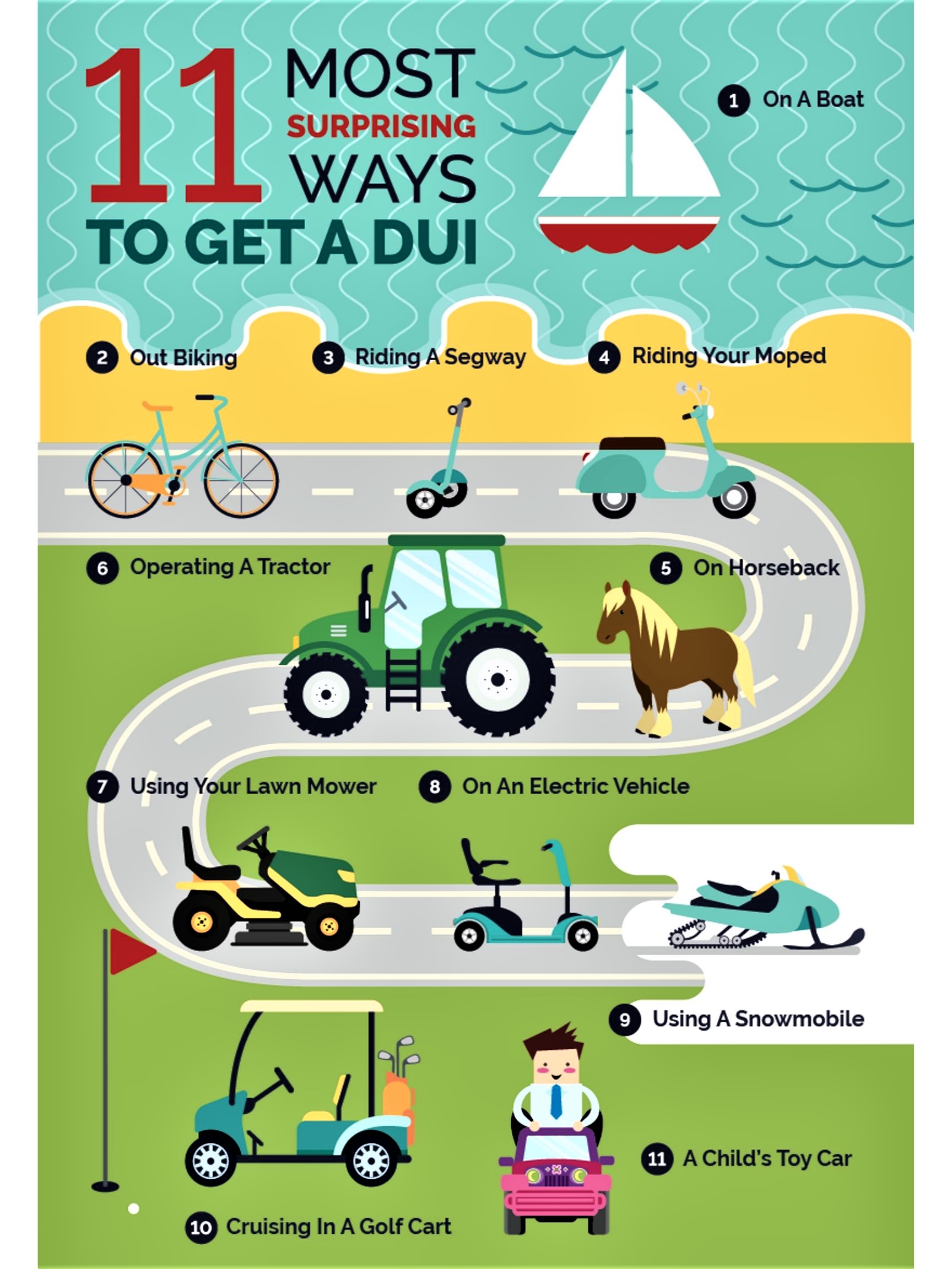 So, what am I trying to get at here with all of this “mumbo jumbo”? You can get a DUI while operating more than just your Corolla or Prius, I am actually going to give you a list of vehicles that are considered motorized that are illegal to operate while under the influence.